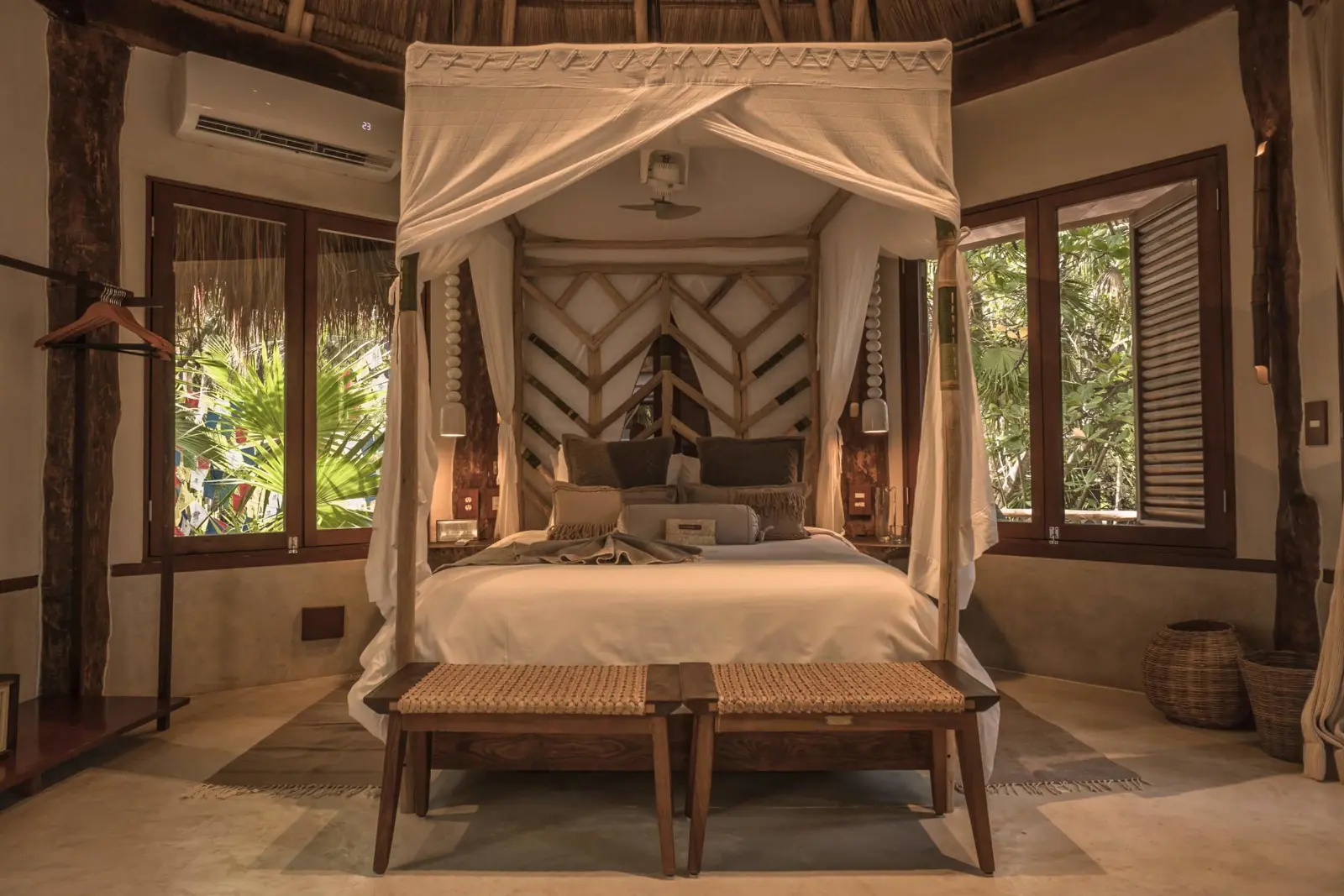 Somos un hotel con un profundo respeto por el medio ambiente. El agua de nuestras habitaciones proviene del subsuelo —del manto acuífero sobre el que se encuentra Tulum. Sacamos el agua de nuestro pozo, la limpiamos y pasamos por un proceso de osmosis. Por esta razón, es agua con un sabor un poco salado, pero completamente limpia y segura para bañarse, lavarse los dientes y manos.